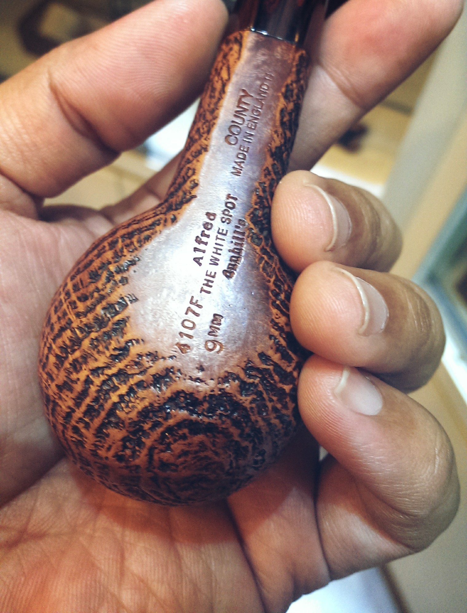 Siri sandblast Dunhill juga mempunyai beberapa variasi yang istimewa dan sukar didapati seperti “Ring Grain” – briar straight grain yang disandblastkan – menghasilkan unjuran pola straight grain dan ring grain pada permukaan bowl. Jenis briar yang sama tetapi dilengkapkan dengan stem Cumberland dan diwarnakan sedikit coklat, dinamakan “Shilling”. Dunhill “County” dan “Cumberland” juga menggunakan briar yang di sandblast, cuma warna coklatnya adalah lebih terang, dipercayai kerana grain briarnya lebih menarik berbanding “Shell” walaupun tidak seistimewa”Ring Grain” dan “Shilling”. Secara peribadi, saya amat menggemari efek “County” terutamanya apabila birdseye tersebar meluas di permukaan sisi bowl.