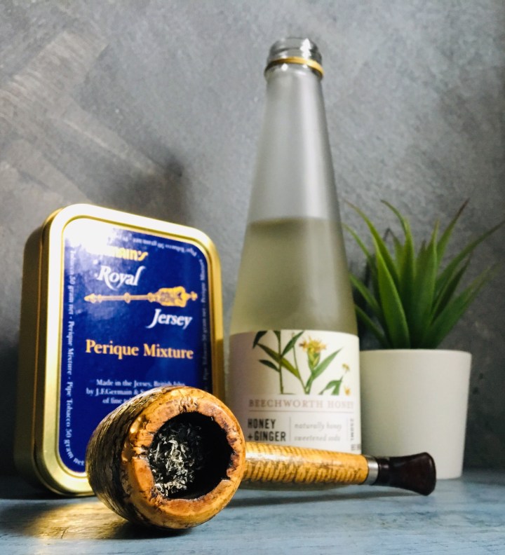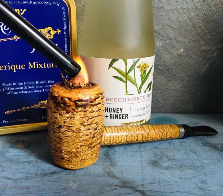 Ribbon yang terdapat di dalamnya memiliki aroma prun dan plum yang ditemani oleh pembayang jerami hapak – bukan nota VA/Per tipikal anda. Keadaannya yang separa kering memudahkan ia dipek rapi ke dalam bowl corn cob Phoenix AM vintaj yang masih kuning keemasan ini. Dek kerana kondisi ribbonnya yang tidak terlalu kering dan tidak juga terlalu basah, pembakaran yang baik dapat dihasilkan dengan mudah dan ember api juga berjaya dihasilkan dengan cantik. Perique Mixture dari Germain & Sons ini secara asasnya menampilkan blend VA/Per yang lebih cenderung ke arah tartness. Mungkin ia tidak se-elegan Elizabethan Mixture dari sudut balance blendingnya, atau se-padu Irish Oak dari segi kepedasan periquenya, namun VA/Per yang diterapkan oleh Germain & Son ini memberikan flavor-flavor earthy dan pungent yang tidak boleh dijanakan oleh blend-blend VA/Per tadi. Atau boleh dikatakan, ianya adalah VA/Per dengan kecenderungan flavor-flavor rustik.